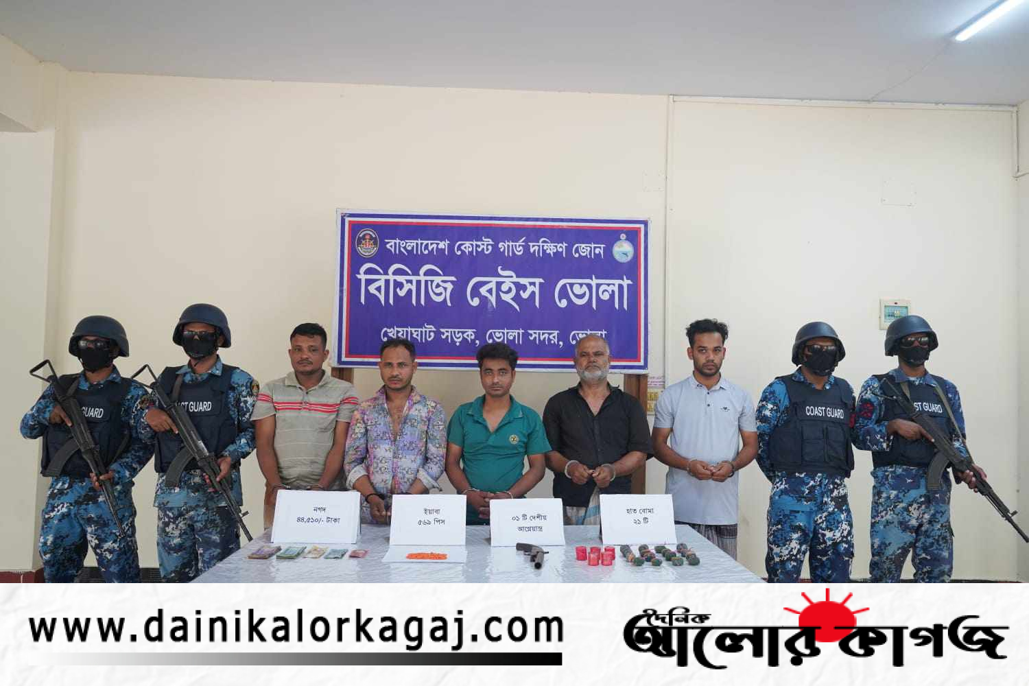ভোলায় কোস্ট গার্ডের অভিযানে একটি দেশীয় আগ্নেয়াস্ত্র, ২১টি হাত বোমা ও ৫৬৯টি ইয়াবাসহ ৫ জনকে আটক করা হয়েছে। আজ শুক্রবার (৪ এপ্রিল) দুপুর ১২টার দিকে কোস্ট গার্ড দক্ষিণ জোনের প্রধান কার্যালয়ে এক সংবাদ ব্রিফিংয়ে স্টাফ অফিসার (অপারেশন) লেফটেন্যান্ট কমান্ডার রিফাত আহমেদ এ তথ্য নিশ্চিত করেন।