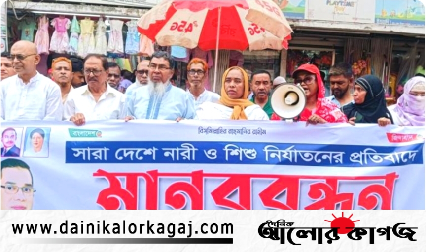সারাদেশে নারী ও শিশু নির্যাতনের প্রতিবাদে মানববন্ধন কর্মসূচি পালন করেছে ভোলা জেলা জাতীয়তাবাদী মহিলা দল ও নির্যাতিত নারী ও শিশুদের আইনী ও স্বাস্থ্য সহায়তা সেল ভোলা জেলা ইউনিট। সোমবার (১৭ মার্চ) দুপুরে ভোলা শহরের প্রাণকেন্দ্র সদর রোডের কে-জাহান মার্কেটের সামনে ঘণ্টাব্যাপী এ মানববন্ধন কর্মসূচি পালিত হয়।